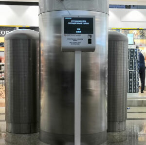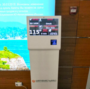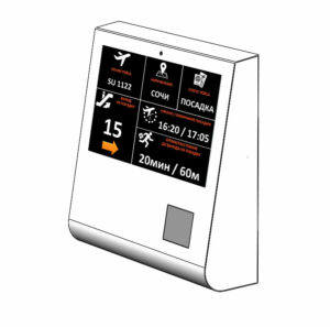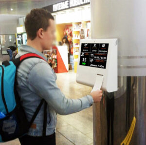 The digital information service device acts as an information kiosk for departing passengers. It is part of the system that tracks and controls the number of passengers in the different parts of the airport.